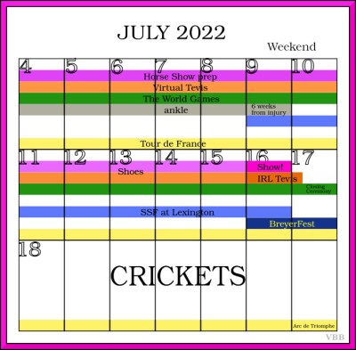 Clashing Schedules. Show & Virtual Tevis vs. The World Games. If we hadn’t had two riding deadlines, I might have moved things around to do more to volunteering at TWG. For example, perhaps a chance to carry one of the signs in the actual Opening Ceremonies and schooling at FHF on another day.