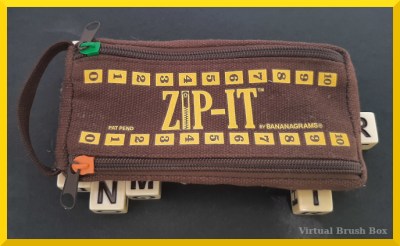 Letters from Zip-It by Bananagrams. Not sure why I have these. Faint memory of getting them when I was part of a writing group. Maybe as writing prompts? Apparently it’s a game. The zipper can be used for a scoreboard. Board Game Geek: Zip-It
