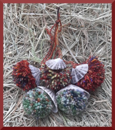 The green ones are left overs from a pair of shawls with Canadian merino yarn by Koigu. The red ones are blanket with mostly handspun from NW and Canada. All hand dyed. The shells are from a genus of limpet that the artist finds onshore.