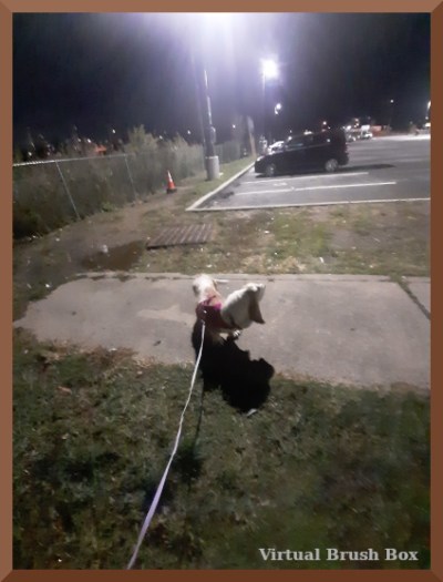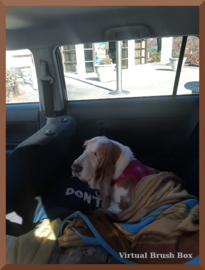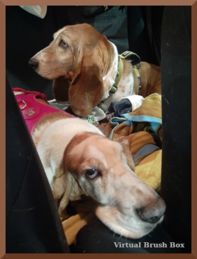 The dogs did not put a paw wrong the entire trip. Slept quietly during the driving. Got out and walked about in a civilized fashion when we stopped. Did not offer a drop or speck of infelicitous bodily functions. After a bad bagel, I came closer to messing up the car than the dogs did.