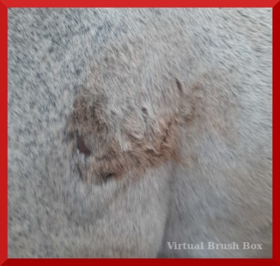 Milton’s shoulder. Notice the distinctly hoof-shaped nature of the injury? Worry not, the discoloration is dirt, not bodily fluids. The abrasion itself had already started to heal over.