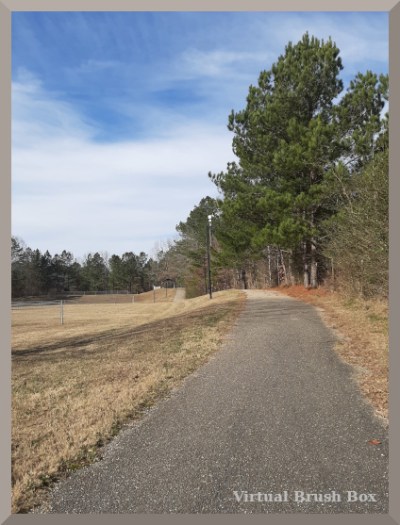 Local park. Muddy month, knees requested a paved path. Took Rose for one lap if minder along to watch her while I finished.