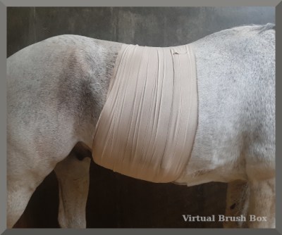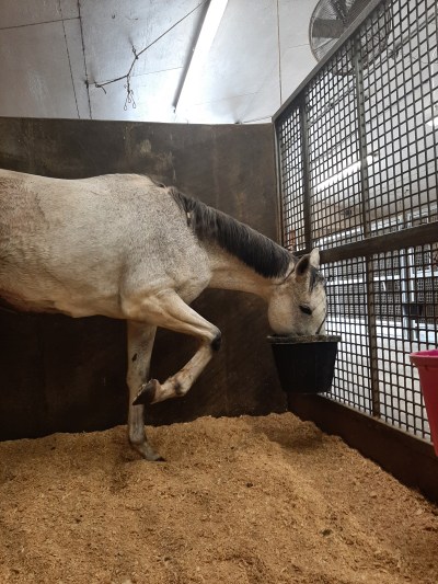 AM. Good report. Bright-eyed and interested in food. Gut doing gut things. Minor incision infection, not unexpected 5 days (!) out of surgery. Stomach edema. May get belly band for support. Waiting on poop, so no lunch or hay, Sad horse face. Was quieter without me in stall, so I left. I think ‘No human equals no chance of food. Might as well chill.’