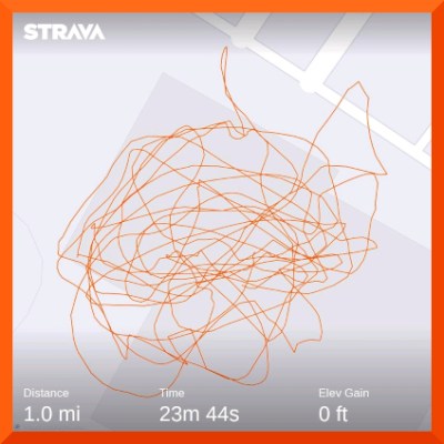 The Y. Now that we have rejoined, I can walk there on rainy days. On this track, 14 laps = 1 mile. Used Strava because there is no way I can count to 14. I lose my place when I do three laps in the pasture. When I do four laps at a park, I walk two laps in one directions, reverse, walk two the other way. I still occasionally wonder if I’m on lap 3 or 4. Once, I did an extra lap to be sure. So 14 laps in one direction is a no-hoper. Map is complete spaghetti b/c inside. The next time, I walked until I was between 20-25 minutes and called it a mile.