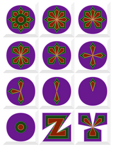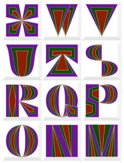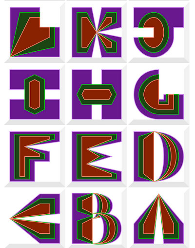 The Z image came to me first. The rest of the alphabet was drawn in compliment. Initially, when I start a file in Inkscape, my color choice is arbitrary. Have I said this before? I just pick something from the color wheel. By the time I’m done working with the letters, I can’t imagine them any other way. Shape, planned; color, not so much.