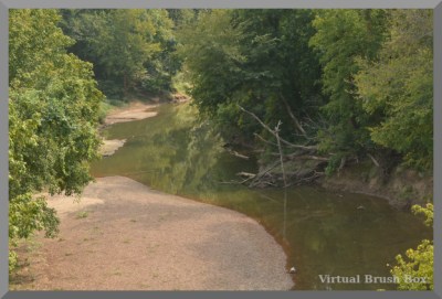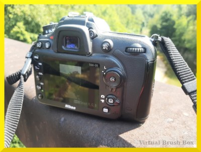 I managed to keep my bright red shirt out of the camera reflection but not the camera strap. I had the strap around my neck to keep the camera safe on the railing. A good meta picture is hard! [Creek]