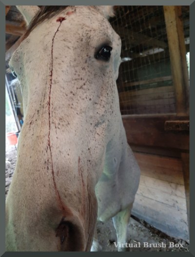 Update. Milt gets fed hay in a muck bucket to reduce waste. We figure was flinging the bucket about and bonked his head on the fence the bucket is attached to. Proving he did no learn from his mistake, he did the same thing a few days later a few centimeters higher up his forehead. Similar size, not quite as dramatically gory. Both injuries healing fine. There is now a blanket hanging over that section of fence as padding.