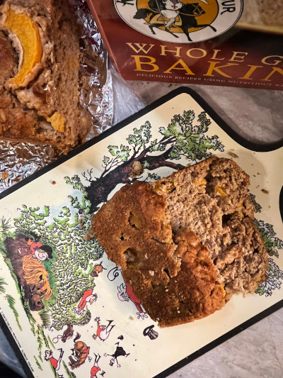 Upon arrival their arrival, I started reading the 600-page cookbook – and have a more chapters to look forward to — and selected Peach-Oatmeal Bread (page 57) for the first recipe to make.