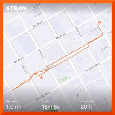 A walk in two parts. I ended up parking (P) .33 miles from an appointment (A). Once that was done, I walked down the street until I was .5 miles from my truck & then turned around and walked back.
