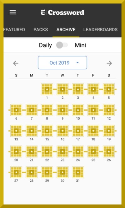 A perfect record for the month? That means getting all the puzzles done and doing on them the day, or the night before. Puzzles are published 10 pm Eastern time.