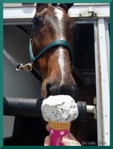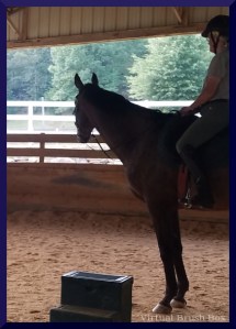 Between hauling the home team about, yay! and massive heat, boo!, we ran out of calendar. Instead of squeezing in a lesson at the last minute, I decided to make a virtual virtue out of necessity. I’d see how well I could show without any prep. Result, good saddle seating, at least on a tolerant and willing school horse, bad attention to detail.