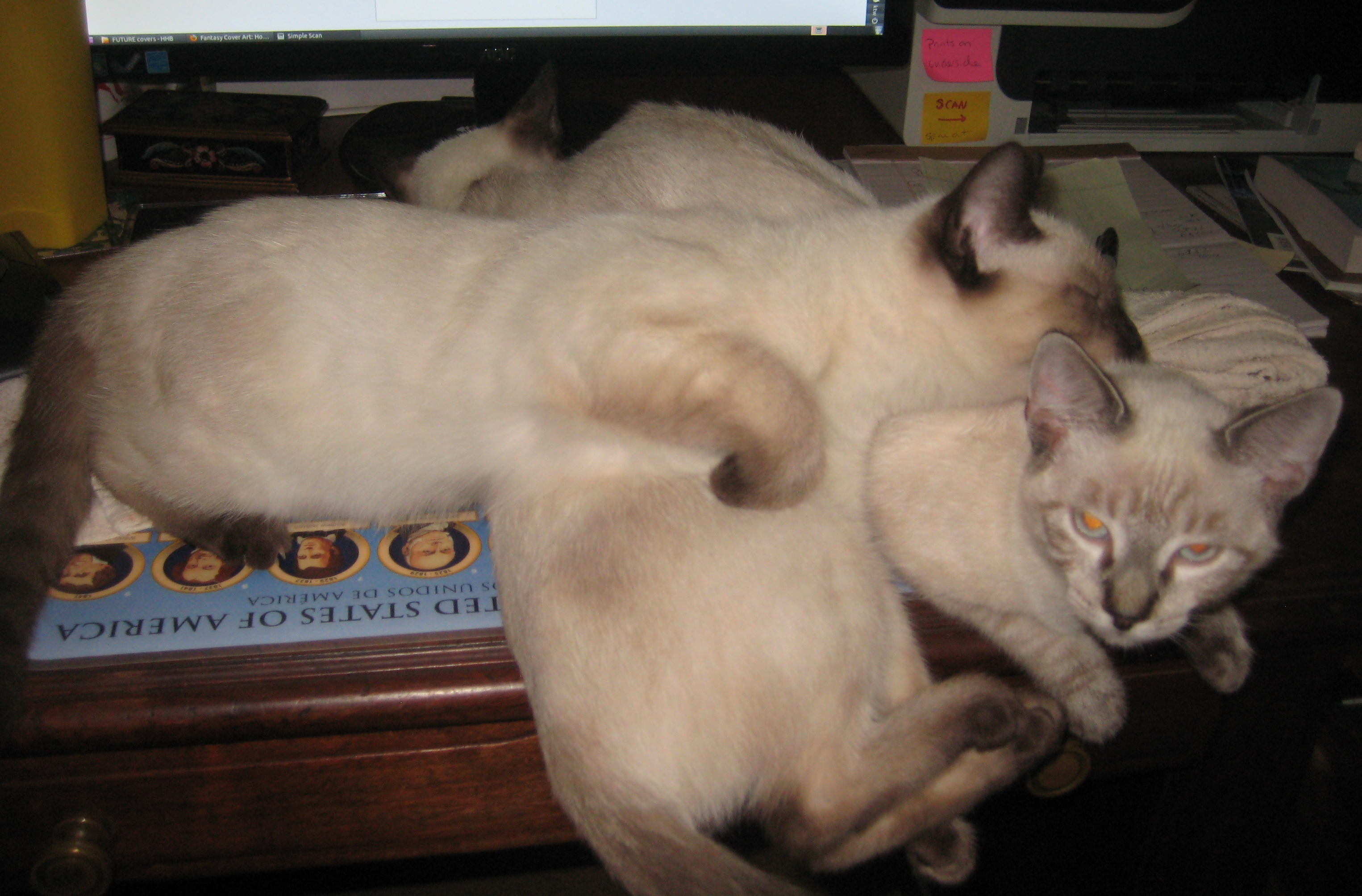 My desk is an enormous wooden law desk, yet all three kittens try to fit between me and the keyboard. This gets harder as they get bigger.