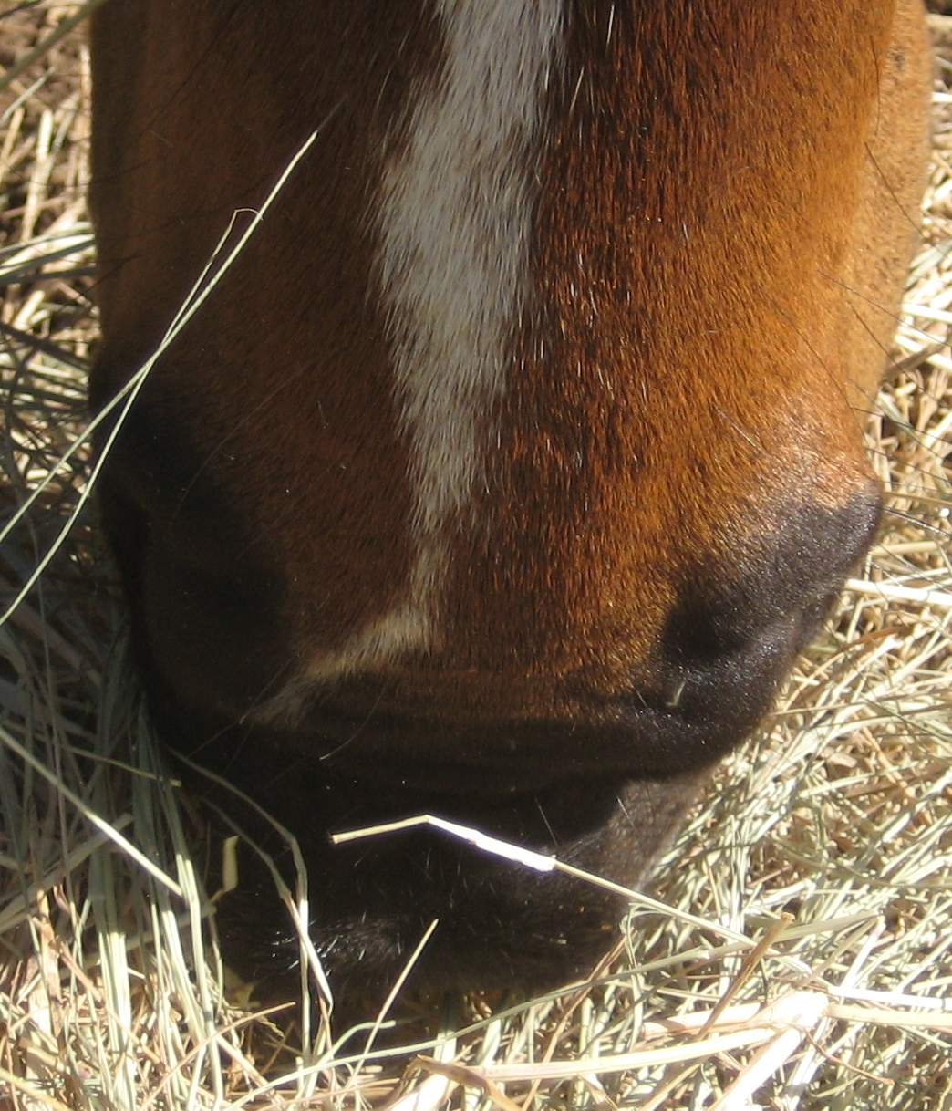 I used to groom for and ride a friend’s hyper-kinetic little mare [pictured here]. In order to maintain a vestige of control, she went in a figure-8 noseband over fences. She’d get hysterically excited before a cross-country trip or a jumping round, but the only way left to express her opinion was to waive her upper and lower lips. She was prehensile. We used to call her “rubber lips”.